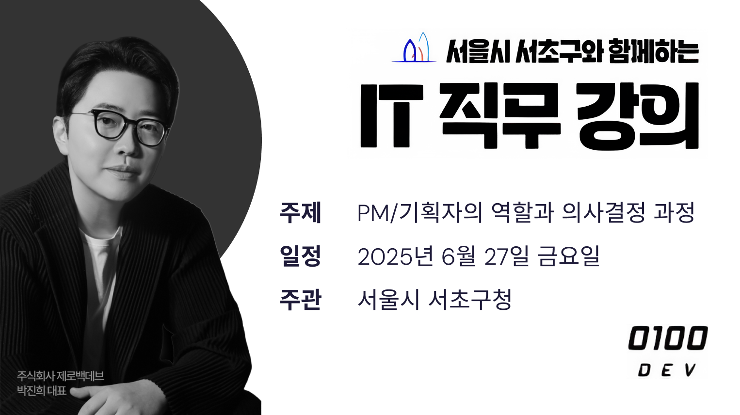 제로백데브 박진희 대표가 서울시 서초구에서 주관하는 IT 직무 부트캠프에 참여해 서비스 기획 실무 강의를 진행할 예정입니다.