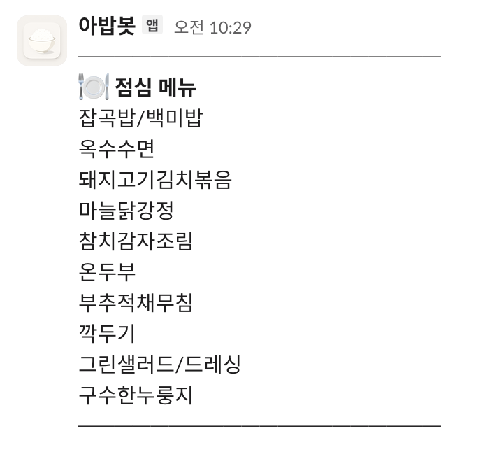 재미있는 점은, 아밥봇에 장애가 발생하면 회사 분위기에 미묘한 파장이 생긴다는 것입니다. 배치 작업을 설정해두었기 때문에 보통 오전 10시 30분에서 11시 30분 사이에 봇이 메뉴를 발송하는데, 이 시간은 모두가 “오늘 뭐 나오지?”를 기다리는 순간이기 때문입니다.