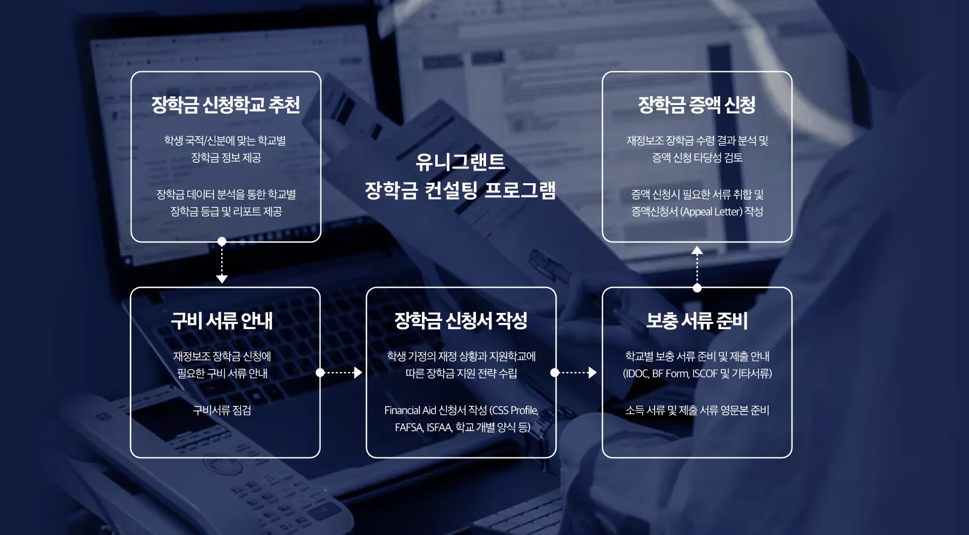 유니그랜트는 미국 대학 진학을 준비하는 학생들을 대상으로, 장학금 수령을 위한 전략 수립부터 실제 신청, 그리고 결과 관리까지 전 과정을 지원하는 교육 컨설팅 서비스입니다.