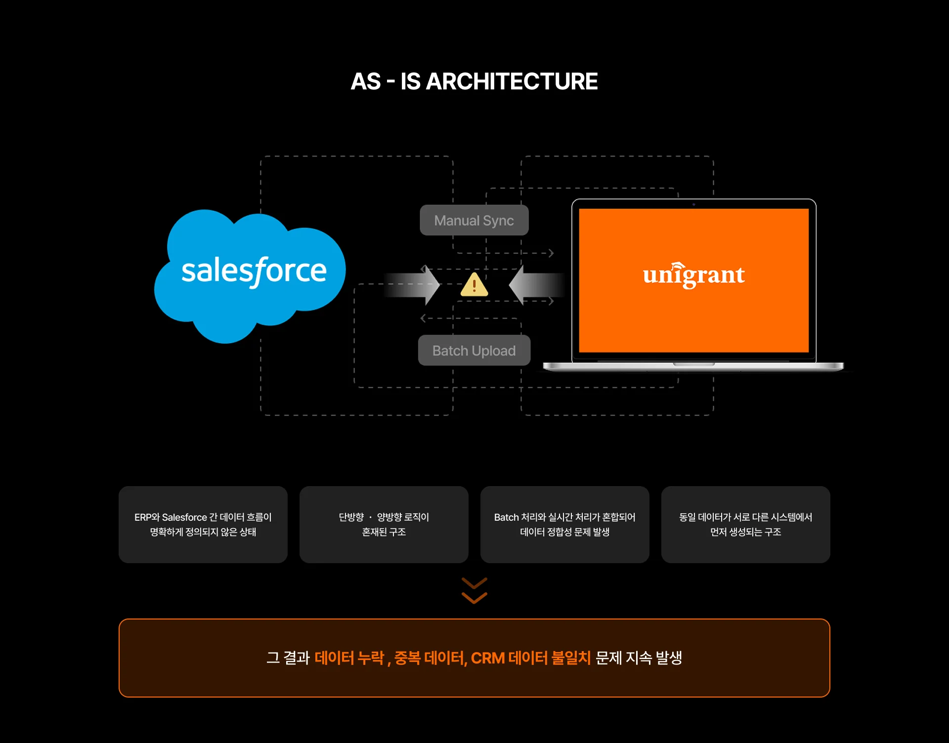 특히 ERP와 Salesforce CRM 간 데이터 정합성은 서비스 품질과 운영 효율에 직접적인 영향을 주는 핵심 요소입니다. 기존에는 데이터 생성 주체가 불명확하고, 수동 동기화와 배치 처리 방식이 혼재되어 있어서 데이터 누락이나 불일치 문제가 반복적으로 발생하고 있었습니다.