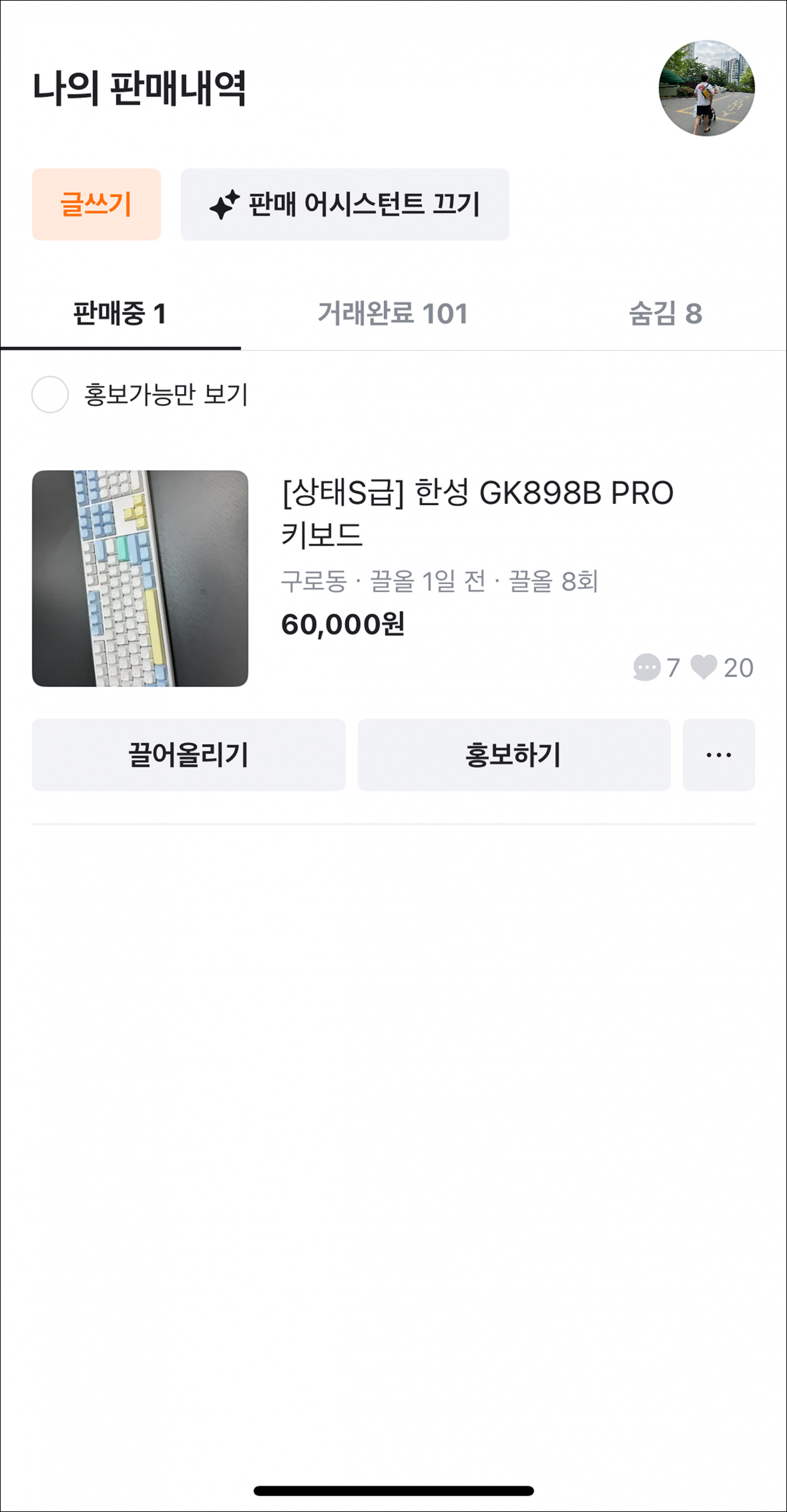 바로 8회 끌어올린 이 이력은 ‘나만 볼 수 있다’는 것입니다. 다른 유저가 제 물건을 조회했을 때는 아래 화면과 같이 이 숫자가 보이지 않습니다.
