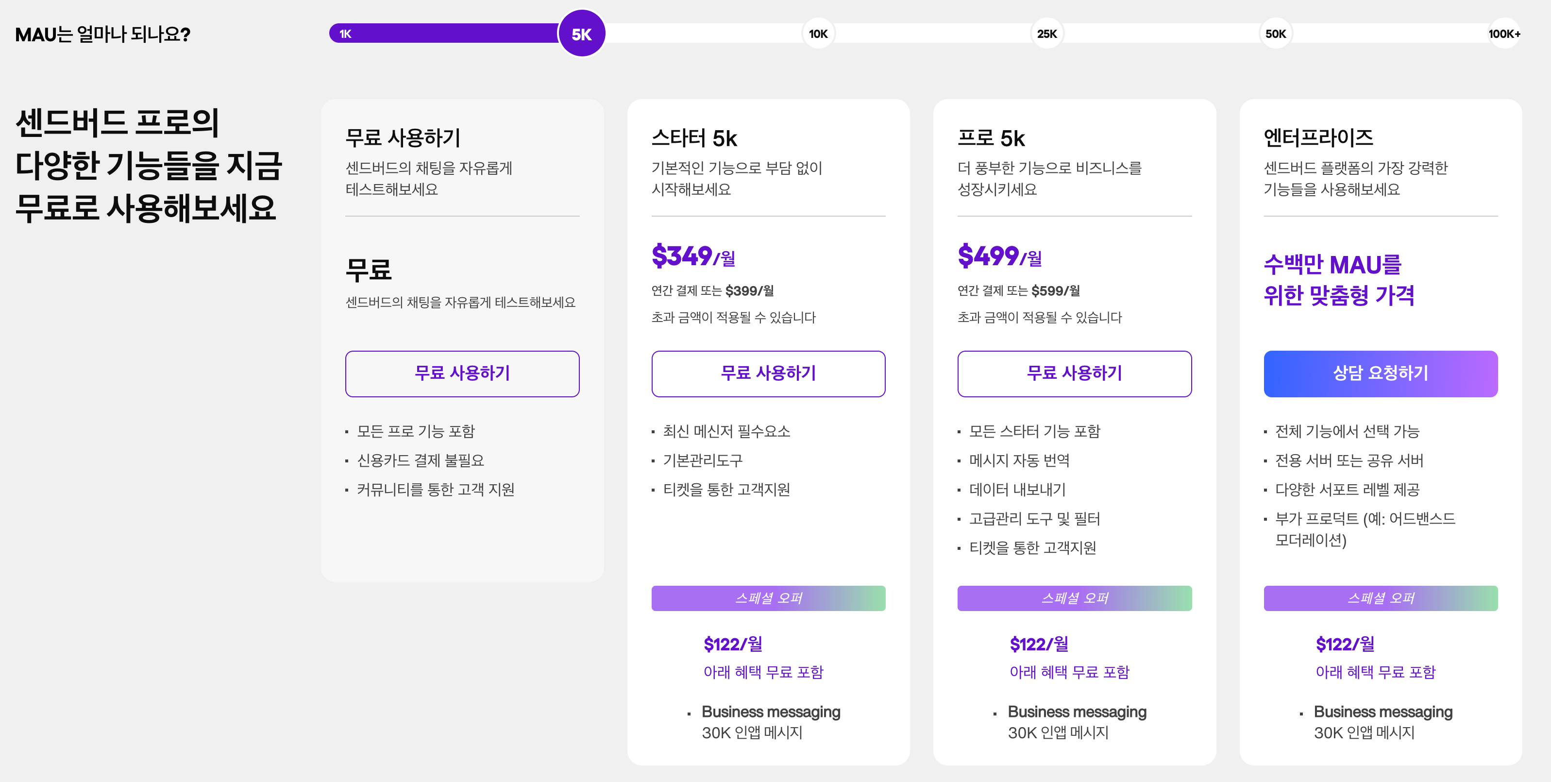 <센드버드 기능 별 요금제, 출처:센드버드 홈페이지>